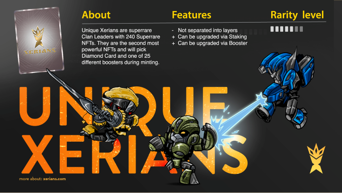 Unique Xerians are the leaders of their race. With 240 Super Rare NFTs, they are the 2nd most powerful characters with the highest scores at the initial minting. They can’t be separated into layers. When they are minted, they randomly come with Diamond Card  and 1 of 25 different boosters (1 of 3 booster slots) in minting.