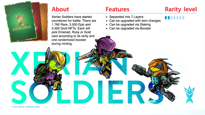 Xerian Soldiers are ready to do whatever it takes to win their fights. They are separated into 9 layers (5 body parts, 1 card color and 3 boosters). Cards will be Gold, Ruby or Emerald. During the minting; the layers, the cards and the boosters will be generated randomly.