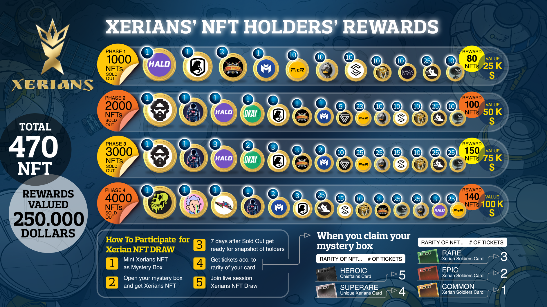 Snapshot will be taken 7 days after each phase is sold out. NFT holders will be eligible for the draw (holding the NFTs as mystery box excludes holder from participating), Xerians reward draw will take place on livestream